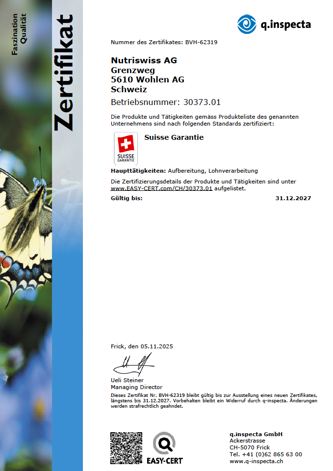 Die Liste der zertifizierten Produkte kann unter qualitaetssicherung[at]nutriswiss[dot]ch angefragt werden.